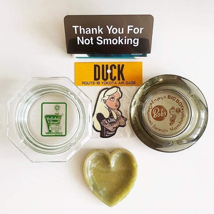 実際使用されてたと思われる、使い込まれた灰皿。プリントも本体も酷使された欠けなどのダメージ有り。それって、新品よりずっと価値があると思う店主。サービス価格で提供します。