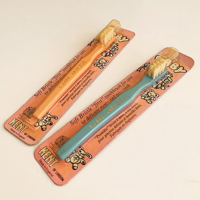80年代初期のKENT製の赤ちゃん用歯ブラシ。製品のプロポーションは勿論、柄部分の字面や台紙もパーフェクト◎歯ブラシオタクのコレクターズアイテム。